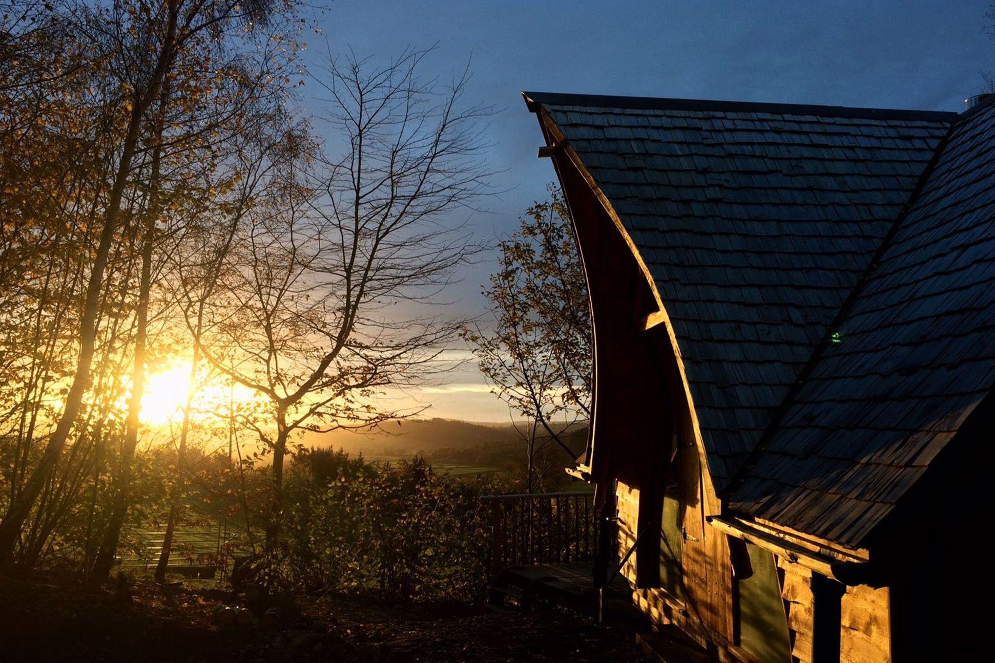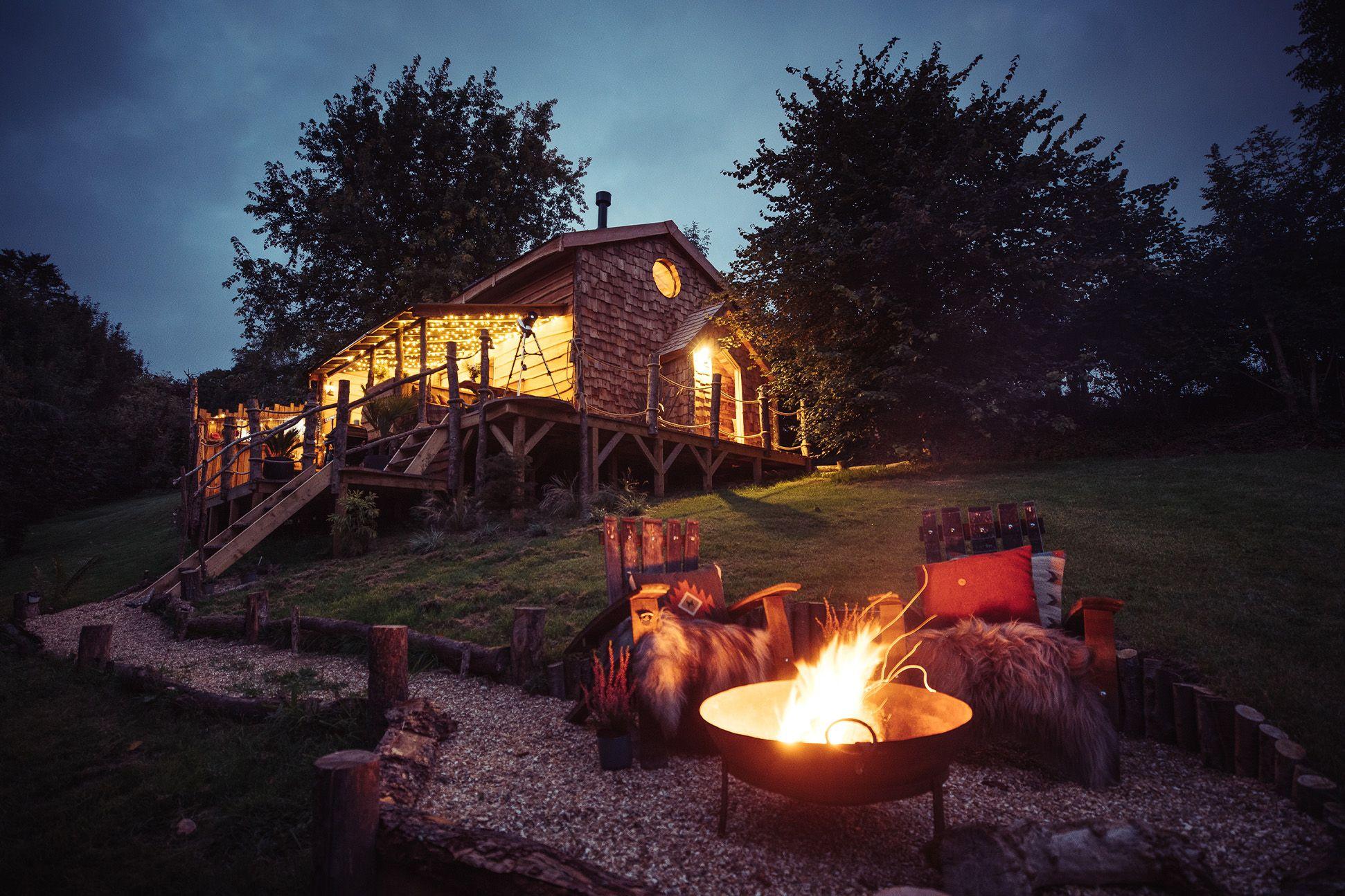 A romantic, hand-carved cabin deep in the Powys woods, Dragon Cruck feels so far removed from everyday life that it requires minimal effort to leave your cares behind. Unwind under blankets on the deck and let the spectacular views down the beautiful Vyrnwy valley work their magic. Soft lanterns and solar lighting set the mood for love outside, while inside the cosy wood burner is well stocked by tree surgeon owner Mike’s wood supply. With a separate camp kitchen next to the cabin, you can whip up a delicious feast in the pizza oven or over the triple gas burner. All that’s left to do is to gaze into each other’s eyes by the fire bowl under clear starlit skies.