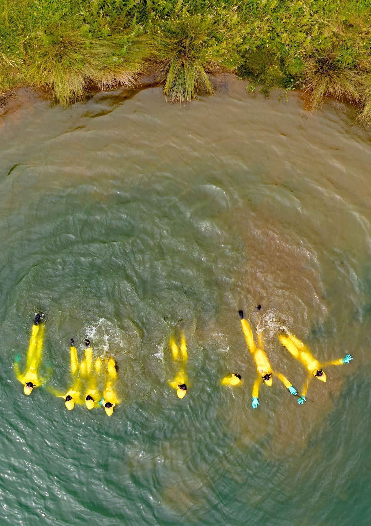 Which brings us, eventually, back to the line of yellow figures wading into a Herefordshire pond. “When we first contacted about swimming in hazmat suits, I put a poll in the WhatsApp group. It’s not exactly something that’s been on anyone’s bucket list, because how would it be, but the response was an overwhelming YES.”