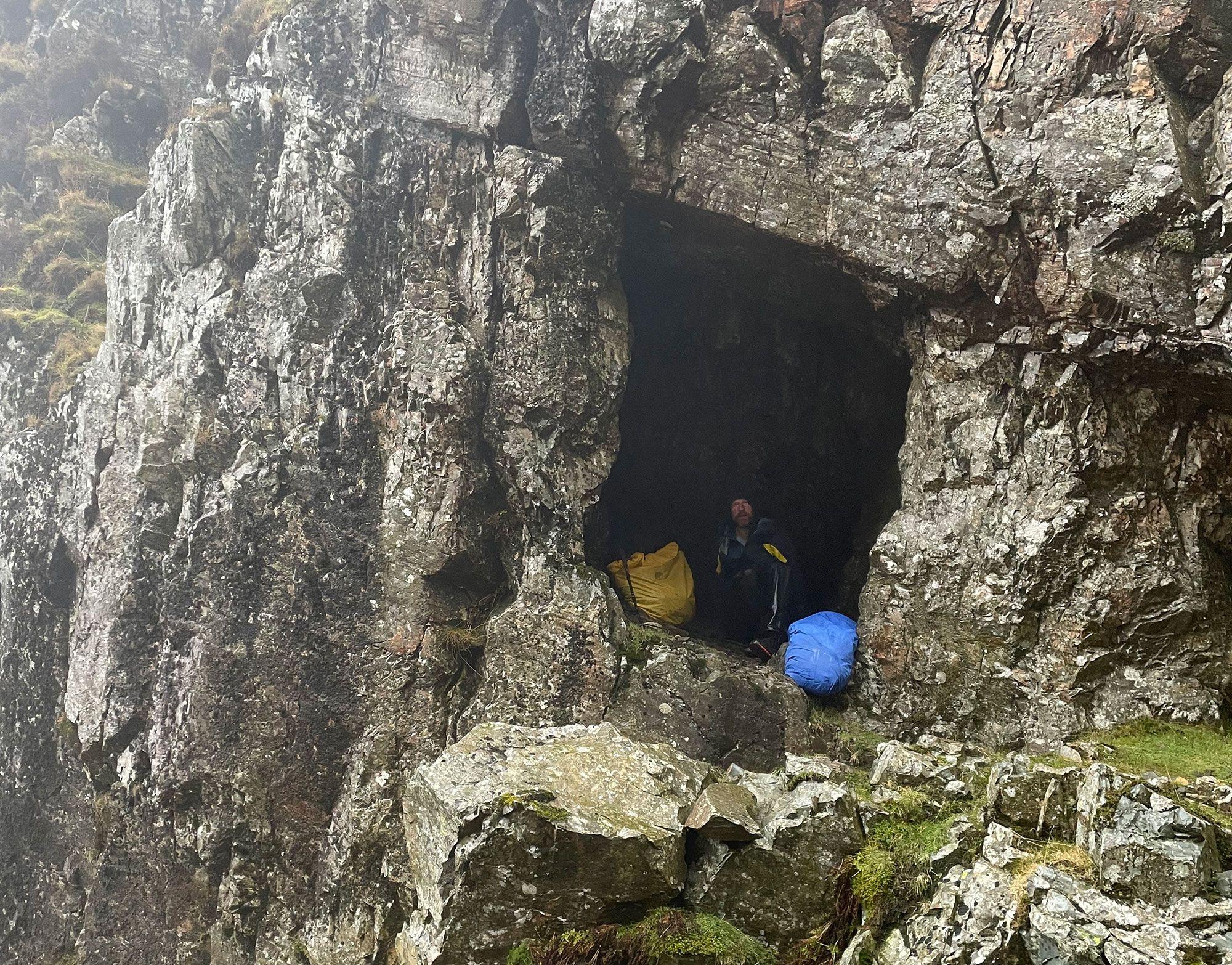 The changeable nature of the weather has kept Russ on his toes, from snow in May to winds that have forced him to crawl to a peak or snapped the poles of his tent. But he has never given up on a night, sticking hard to the rules – he must climb to the summit and camp on the mountain, as close to the top as is sensible, without coming back down. Sensible, in this case, is a relative term, as Russ’ night on Jack’s Rake testifies. The “walk” alone is a scramble up a barely visible path, with a sharp drop waiting if you stumble, but the camping spot is another level altogether.
