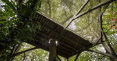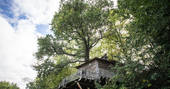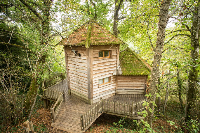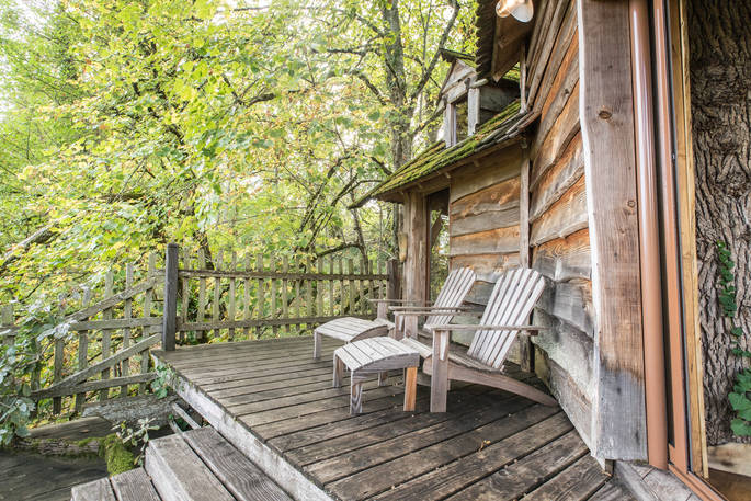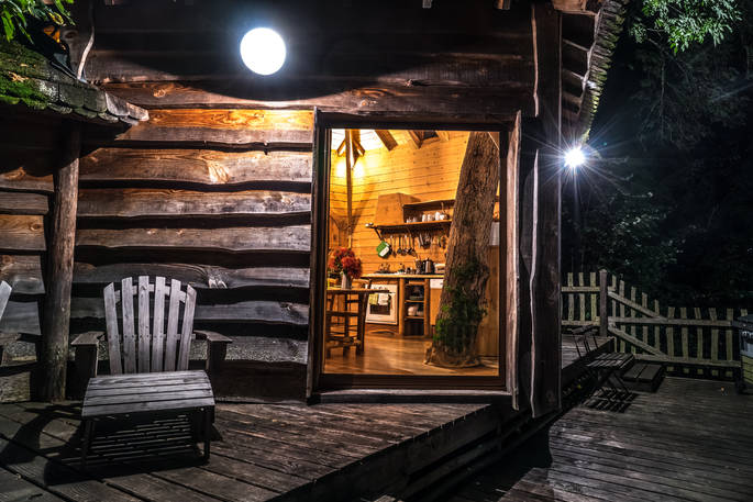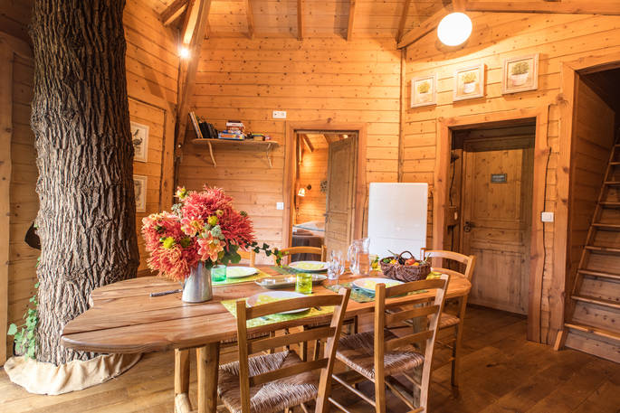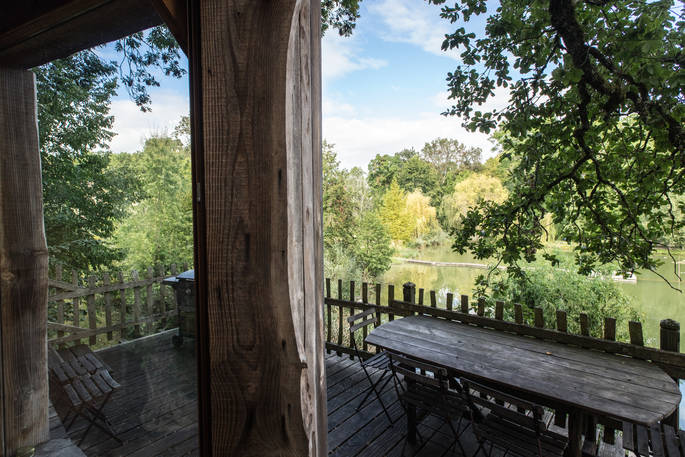 You'll approach the Lakeside Lodge down steps carved out of the slope and through a fancy, carved door. This treehouse is in fact made up of three pentagon-shaped rooms, co-built by owner Stéphane. The kitchen and living area makes up the central room, spacious with a high, beamed ceiling. You couldn’t be closer to the trees; there are two tree trunks (one ash and one oak) growing up and through the high ceiling, framing the view over the lake through the large windows. Off this room is the main double bedroom, with an ensuite bathroom and walk-in shower. Finally, a mini staircase leads up to the cosy upstairs bedroom, perfect for kids, with fun cut-out windows in the shape of an oak leaf and eagle.