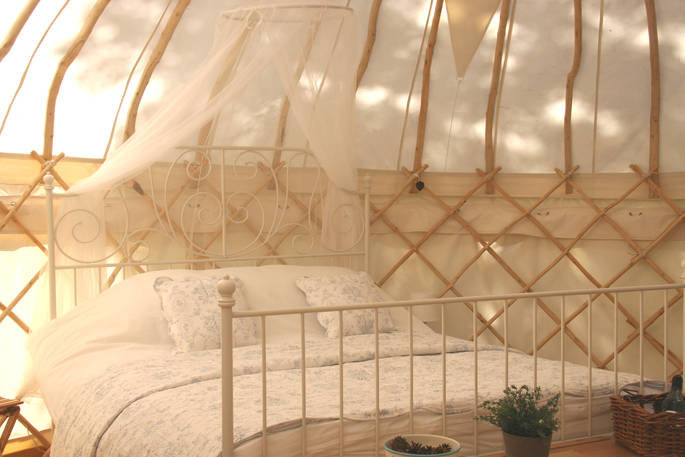 The four yurts are light and uncluttered, handmade from ash coppice and set in private grassy clearings, accessed along paths cut through the long grass and wild flowers – Forget-me-not, in a romantic spot right at the top of the hill, is the most private and has fantastic views (try Rosehip if you want to be closer to the facilities). Each has a private compost loo behind the yurt, and its own shower room in the shower block.