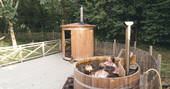 - Shared sauna and hot tub on a wooden deck with childproof lock.
