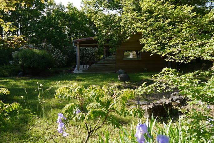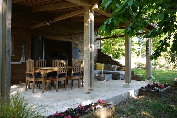 A kilometre down a track from the tiny village of Parisot lie the grounds of Coutillard and among the trees in a secluded corner is Cabane dans les bois. The cabin is designed to immerse you in the peace of its surroundings. The open plan layout and folding doors blend the sophisticated kitchen with the outdoor lounge, where you can eat at the dining table or laze on the corner sofa, with the sounds of wildlife all around you. When the heat of the day fades, you can retreat to the comfy seating indoors, light the wood-burner and relax with books or a film.