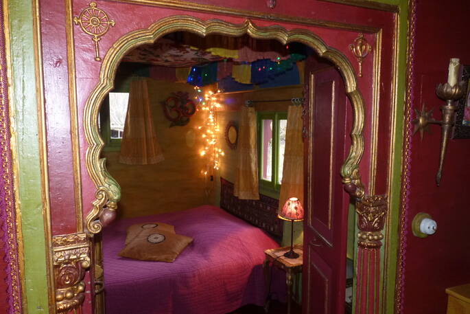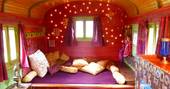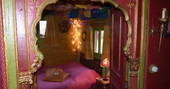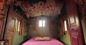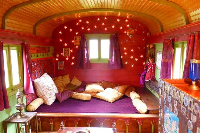 Let yourself be dazzled by the eastern splendour of this roulotte, and an interior that will take you right inside the Arabian Nights. Settled peacefully in the gardens of Pascal and Pascaline’s house, it dates from the 1900s and is a truly authentic example of the traditional roulottes that used to accompany the travelling fairgrounds of the early 20th century. Your hosts are well-travelled artisans, who have a passion for restoring these magical old wagons. They’re talented in the kitchen too - breakfast, homemade and delicious, is served in the house or in your outside garden sitting room on fine days, where you can take in the views! Tiled loos and showers are steps away in the guests' section of the house, along with a large farmhouse kitchen and breakfast room shared with the other roulottes where you can cook and socialise, though you are free to gather wood in the forest for a traditional campfire of an evening, woodsmoke curling up towards the stars. Tranquil, remote and utterly enchanting.