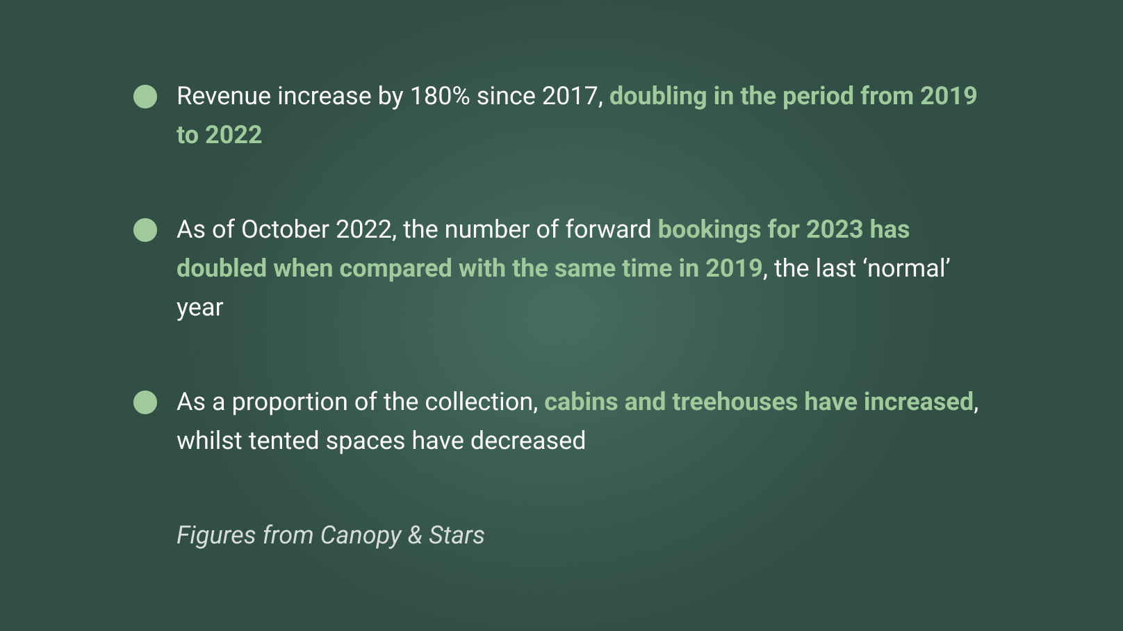 As the leading glamping company in the UK, our own performance over the last five years reflects the market’s strength. Our collection's net growth is 660 spaces and our revenue has increased by over 180% since 2017, doubling in the period from 2019 to 2022. The availability of quality spaces and a trend towards structures like cabins that provide year-round occupancy, coupled with a shift towards longer stays of higher value, have moved glamping out of its summer niche, vastly increasing its potential.
