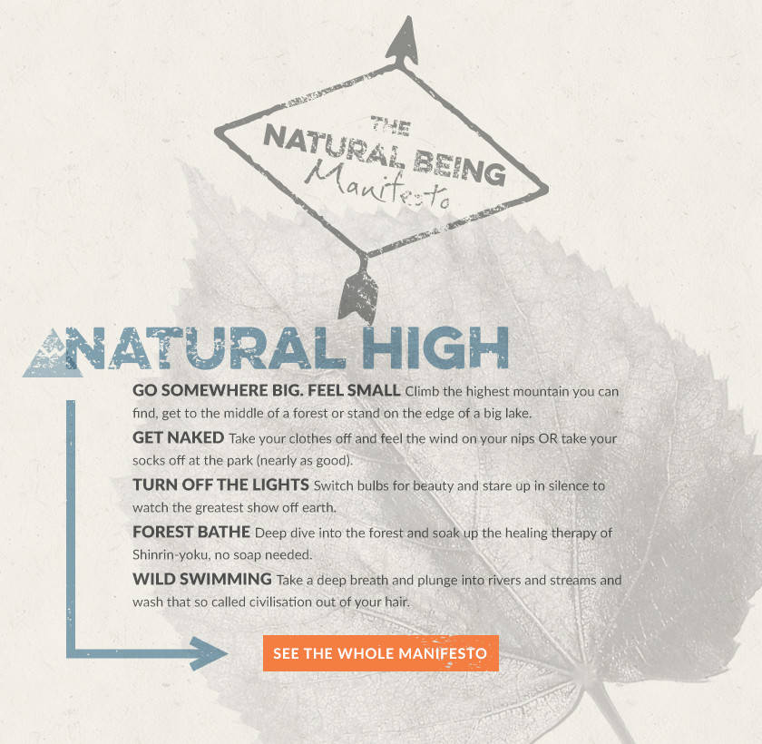 Our highly scientific, professional and exceptionally important manifesto lays out the four stages on the path to Natural Being. Getting a Natural High is the second step of the process; join us and feel the stress evaporate as nature surrounds you, letting mud and happiness settle where those little worries used to take up room. Click above to see the full manifesto or skip straight to some places to awaken your Natural Being below.