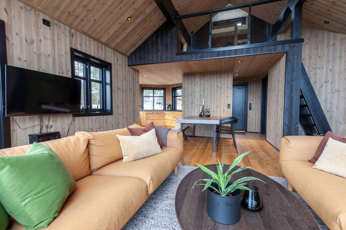 Turn left onto Fv455 for 1.2km and then right onto FV460 for 12.3km. Once you see the sign for the Fv508, turn off and follow for 2.6km and turn left into Birkeland. Then turn right and drive towards Havreseland for 0.9 km. Then turn right and drive towards Tretopp Hytta for 1,5 km. If you want to walk 650 meters on the trail to the cabin, please park at the sign "P-Sti. If you want to row or paddle 300 meters across the lake, please park at the sign "P-Kano".