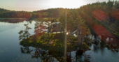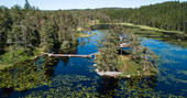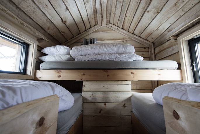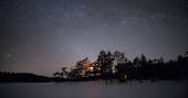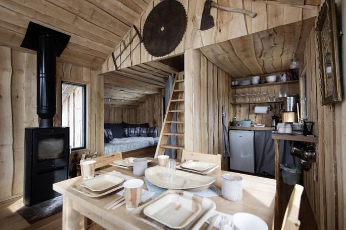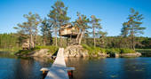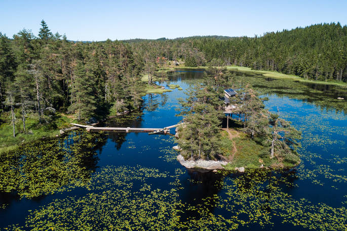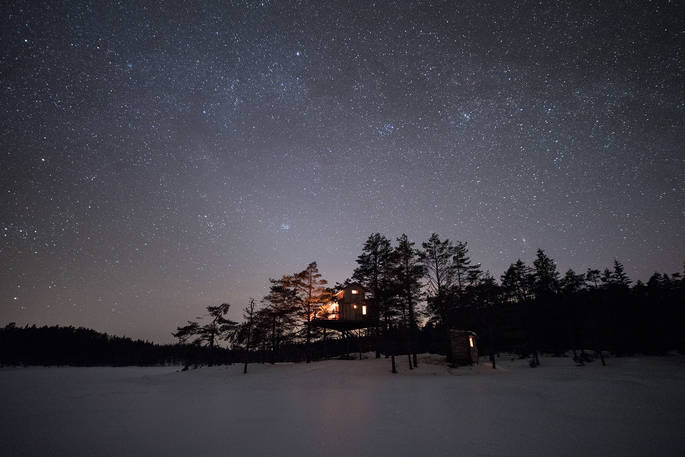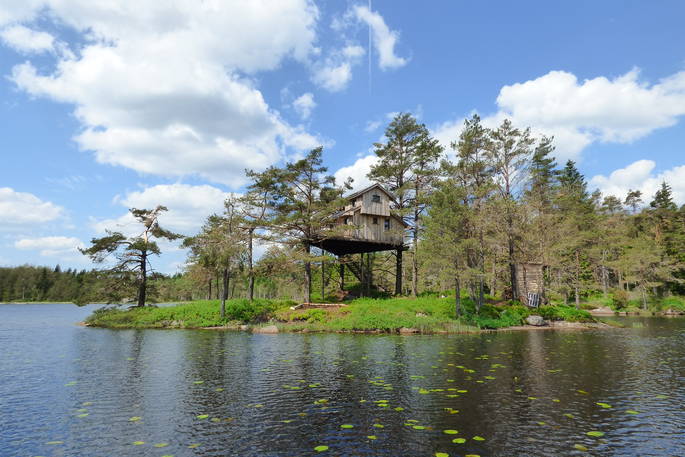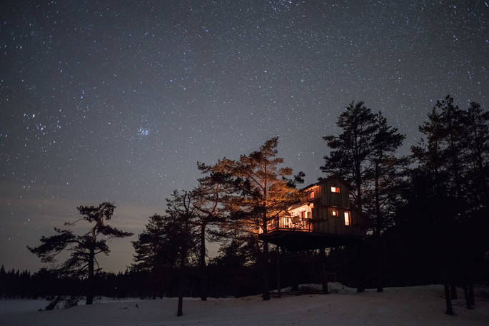This is a place where memories are made: splashing in the lake, hunting for wild berries, snuggling up together in front of the firepit with a sheepskin rug. There’s space for five in a cosy double sofa bed and a bunk room for three, a hammock for napping and a little living space with a table at which to gather. Wake to majestic views of trees and sky from big windows, and step out onto the balcony to breathe in lungfuls of the freshest air. You’re high up, mounted atop a platform between three old pines – all you can see is yours to explore. Bring bed linen and towels (or hire them for more packing space) and sturdy boots for exploring. Though there’s plenty of torches and a fire to light your way, a head torch is a fine idea for late night trips to the compost loo in the outhouse. There’s a outdoor battery shower available in the warmer months, but the lake is clear and cool also. Become a real hunter-gatherer: collect drinking water from the farm and pump it to the tap by foot, stick your supplies in the solar-powered fridge and fish for your supper – there’s trout in the lake and a rod provided. You park nearby and have two choices to get here: walk through the woods and across the floating bridge, or row yourself out. In winter, the ice freezes thick enough to cross on foot.