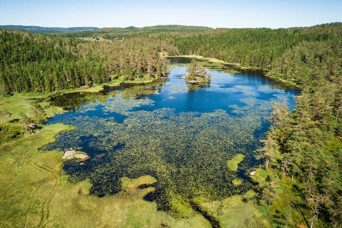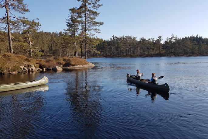 Turn left onto Fv455 for 1.2km and then right onto FV460 for 12.3km. Once you see the sign for the Fv508, turn off and follow for 2.6km and turn left into Birkeland. Then turn right and drive towards Havreseland for 0.9 km. Then turn right and drive towards Tretopp Hytta for 1,5 km. If you want to walk 650 meters on the trail to the cabin, please park at the sign "P-Sti. If you want to row or paddle 300 meters across the lake, please park at the sign "P-Kano".