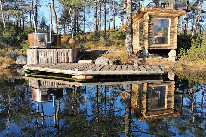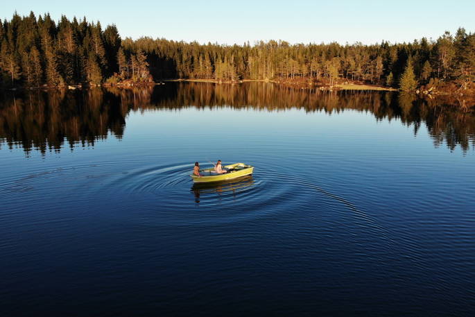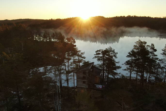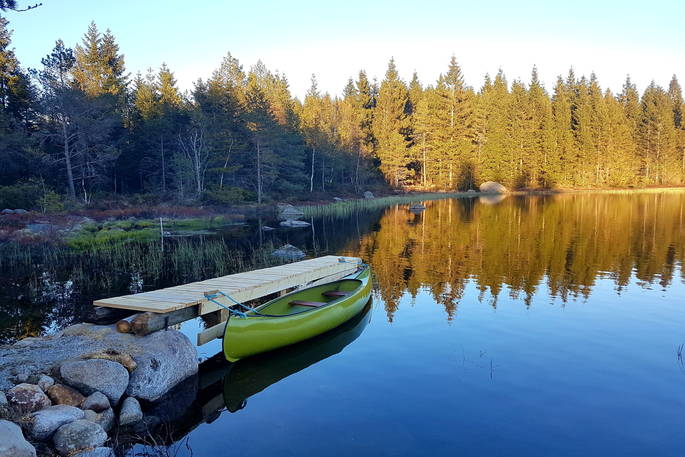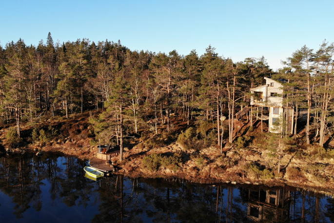 Turn left onto Fv455 for 1.2km and then right onto FV460 for 12.3km. Once you see the sign for the Fv508, turn off and follow for 2.6km and turn left into Birkeland. Then turn right and drive towards Havreseland for 0.9 km. Then turn right and drive towards Tretopp Hytta for 1,5 km. If you want to walk 650 meters on the trail to the cabin, please park at the sign "P-Sti. If you want to row or paddle 300 meters across the lake, please park at the sign "P-Kano".