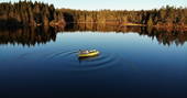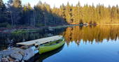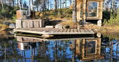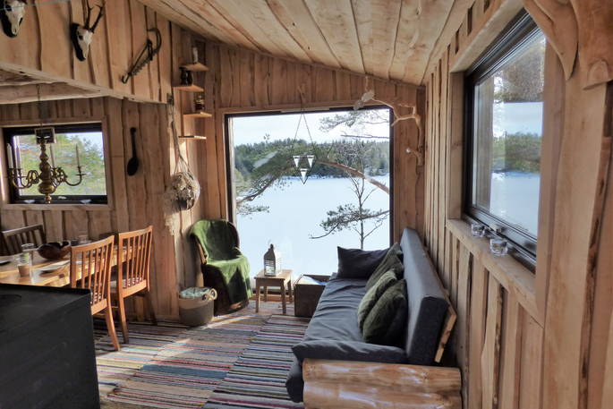 From the parking you can follow the walking trail (350 meters) or paddle/row over the lake (300 meters). Start rowing on the right side of the lake, and soon you will see the cabin on your right side. There is a wooden port to tie up the boat by the Wilderness Tower. In winter, there may be ice on the lake or a lot of snow. In such cases, we must keep in touch the day before arrival to arrange the best way for transport you to the cabin.