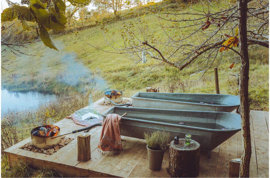 Increasingly popular and can help with year-round bookings, convincing guests who might not want to bathe outside in the winter that they will still get a wild spa experience. They also give you a chance to get creative with cold plunges or bucket showers, which can be a fun addition. Read more here.