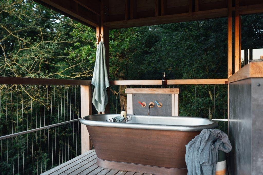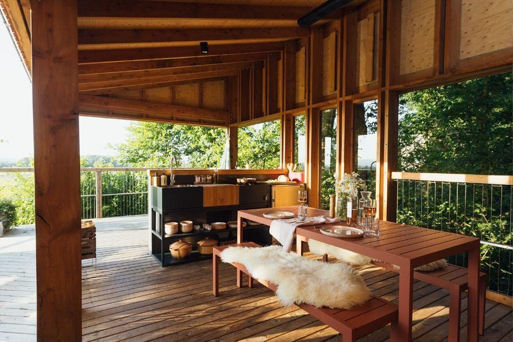 Rewild Things have elevated their outdoor experience by incorporating an outdoor covered kitchen and an outdoor bathing area: