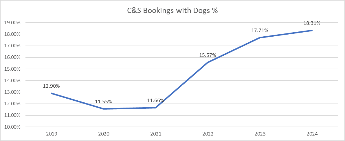 The trend for people searching for dog-friendly holidays in google has also been increasing steadily year on year since 2004 and that is reflected too in the graph below showing the growth in the % of C&S bookings with dogs over recent years – a significant increase.