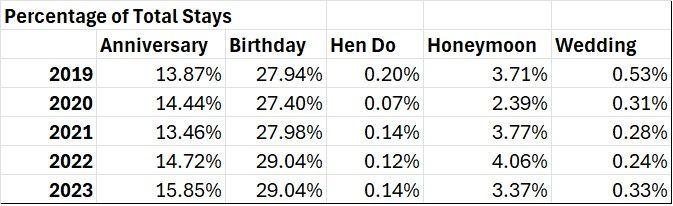 This year, we have seen a big increase in bookings for occasions, with over 50% of our bookings now attributed to occasions. In 2018, 13% of bookings were made to celebrate an anniversary, 28% birthday and 4% honeymoons so the demand for a wilder place to celebrate that special occasion is on the up.