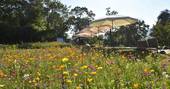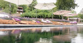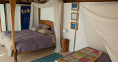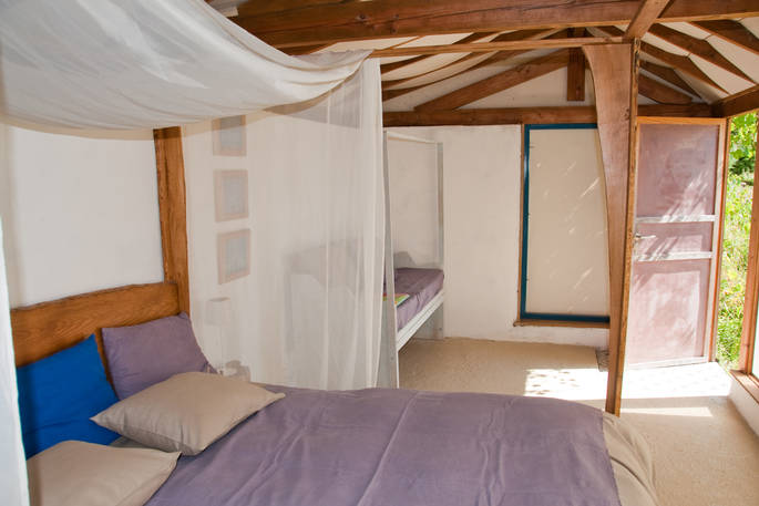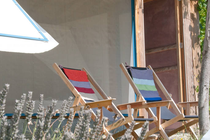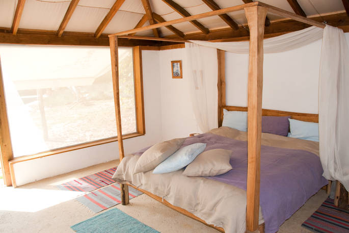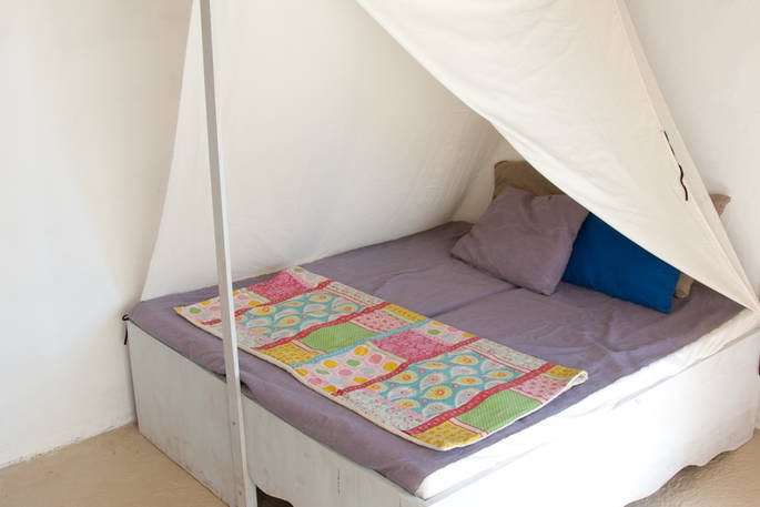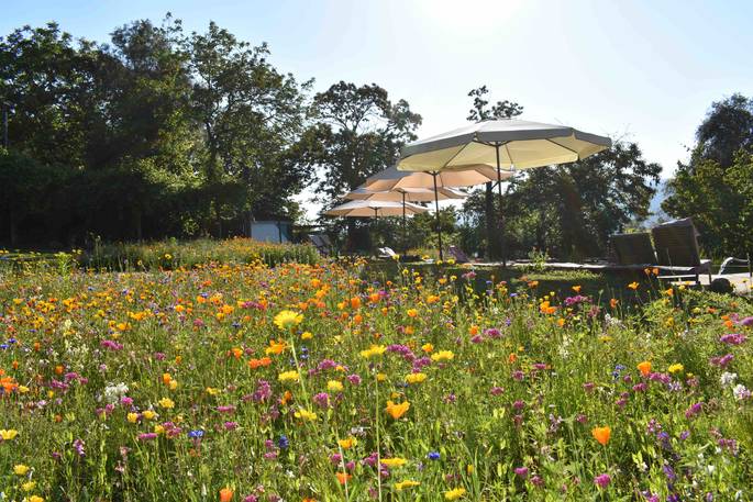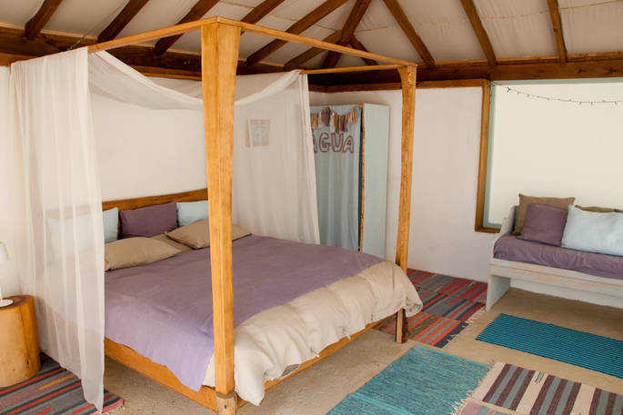 Drop-Inn was dreamt up by lively Belgian couple, Joëlle and Dirk, and is set amongst wildflower and lavender fields over four heavenly levels. Amid the colourful hues and at the foot of the estate, all guests are welcome to take a dip in the inviting spring-fed pool and have a play at the skatepark! About 15 meters from the pool, you'll find your canvas cocoon, The Water Lodge. At the heart of the lodge is a king-size canopy bed, handcrafted, along with the rest of the furnishings, by the owners using natural materials. Fold out the sofa to make a magical tent for little ones to sleep in or pitch a whimsical tipi just outside for your more adventurous Cherokees. A little further up the wildflower fields, there is a facilities lodge where you'll have your private bathroom with hot shower and loo.
