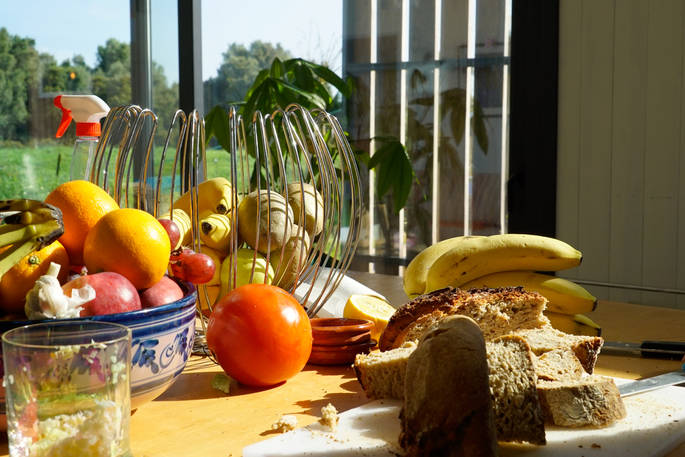 Coffee, tea, milk, bread, a bottle of wine and 5 litres of water are provided. Condiments, rice and pasta are also found in the kitchen.