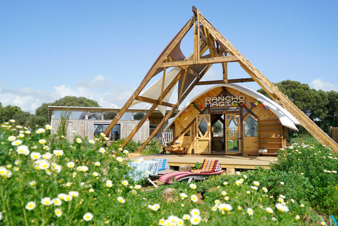 The magic of Magic Ranch is a quiet sort of thing, that washes over you like the sound of the waves the moment your feet step onto the unspoilt beaches just moments away. Magic HQ is the largest of the three cabins, with two double bedrooms and an open plan kitchen and living room that opens onto sea views via sliding glass doors. It’s well equipped for your daily needs in terms of washing and cooking, but the whole site goes beyond mere comfort. With broad decks, trapeze swings and terraces inviting you to unwind literally with a little yoga, or figuratively with coastal walks followed by long naps in the shade of the palm trees. Around you is an extensive natural park where local retinto cows graze, chameleons sunbathe and birds flit among the meadows, all within sight and sound of the wild Atlantic.