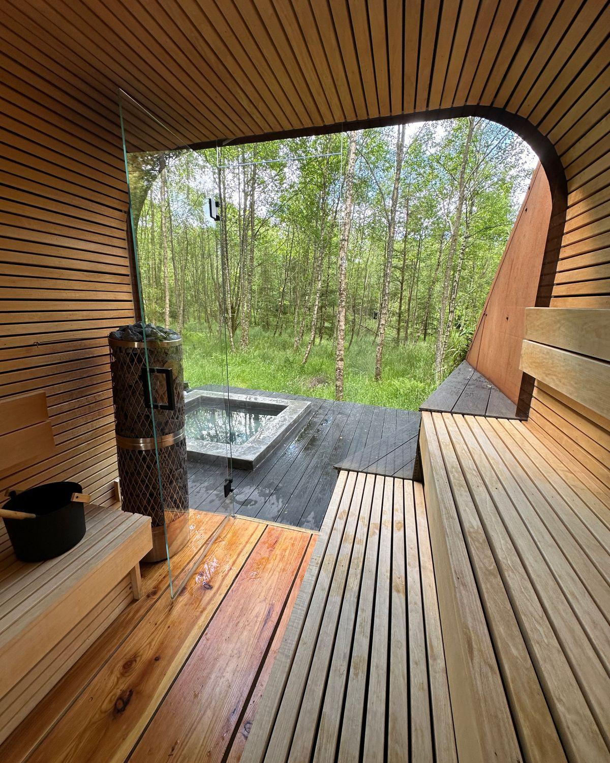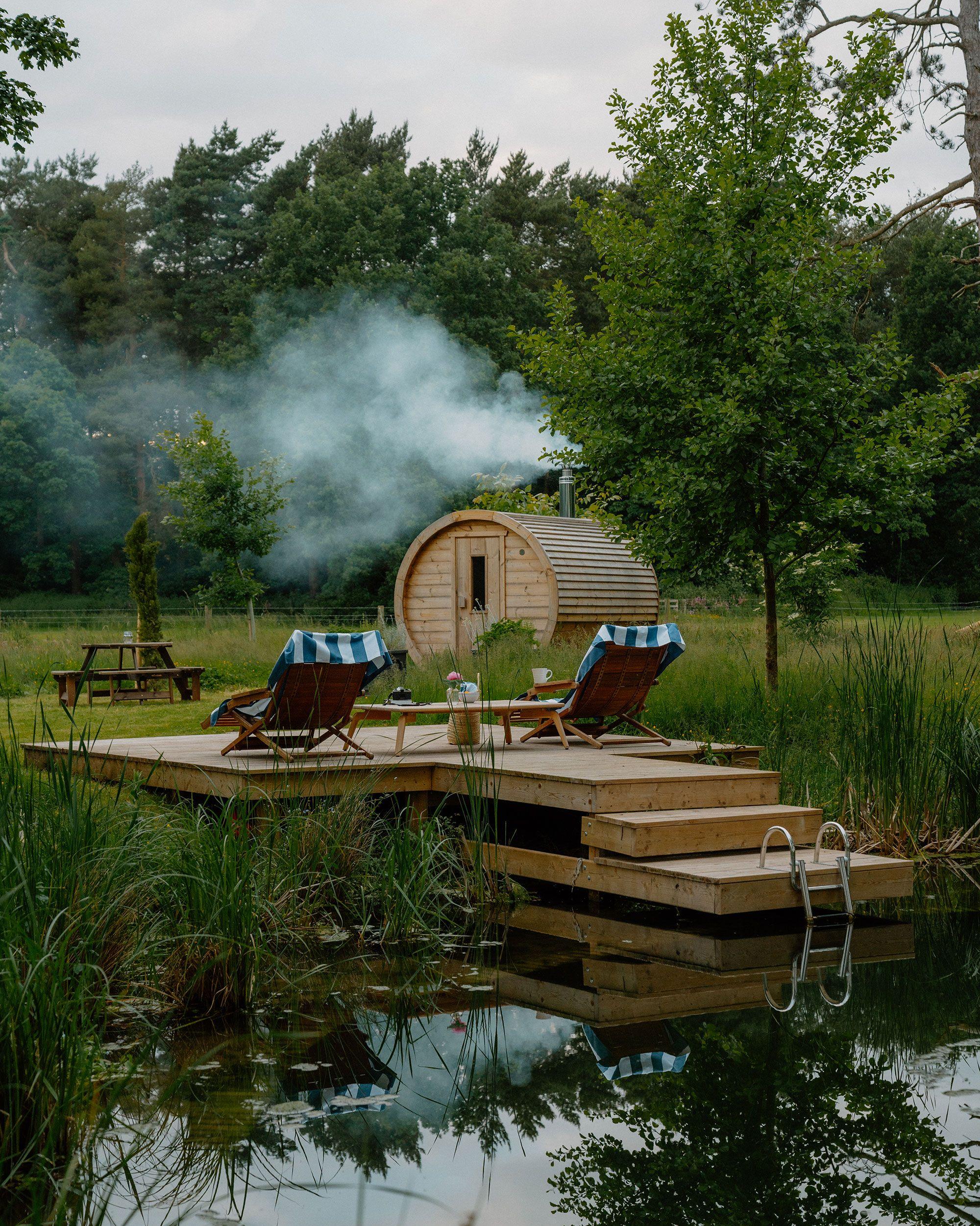 Down at the lake, through the trees from your cabin, you'll find the sauna deck, right next to its own rather large natural plunge pool. You'll need to book a slot, but there are hammocks in the woods up at your space to make the wait swing by and an outdoor bath if you need a soak after your steam.
